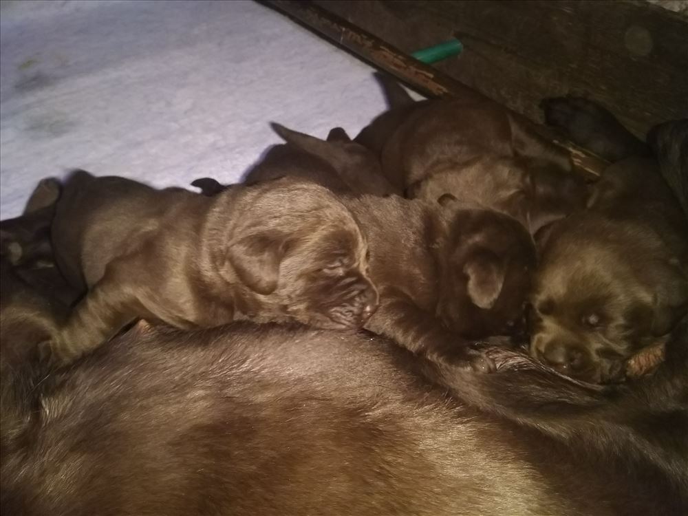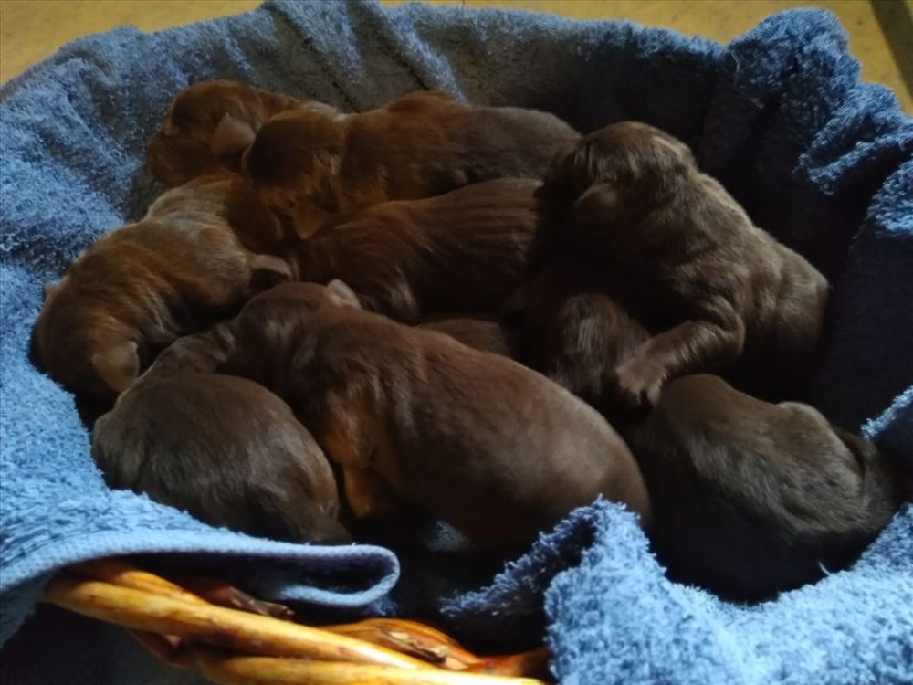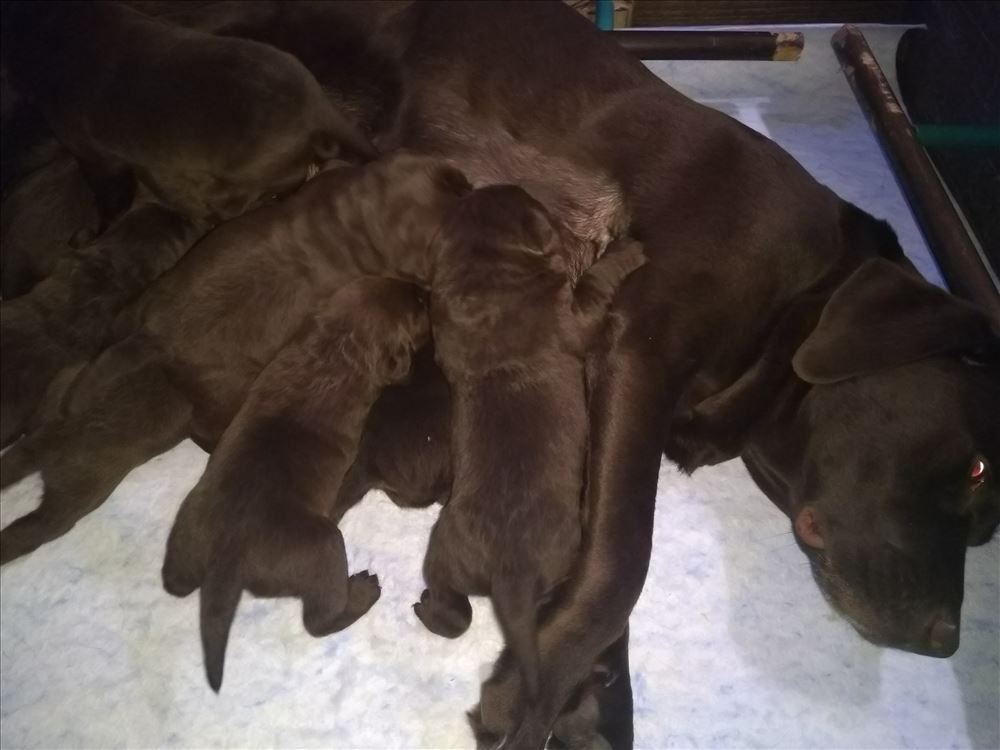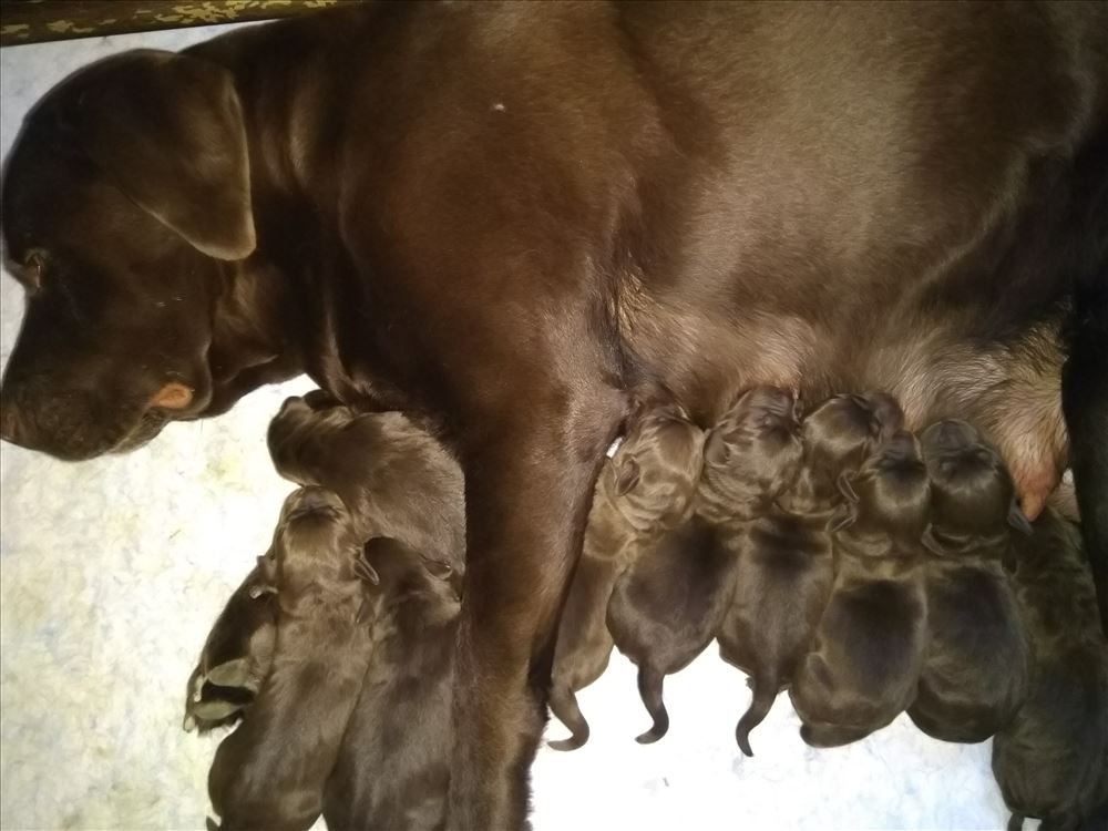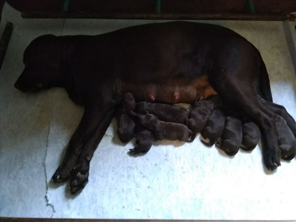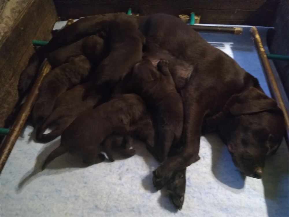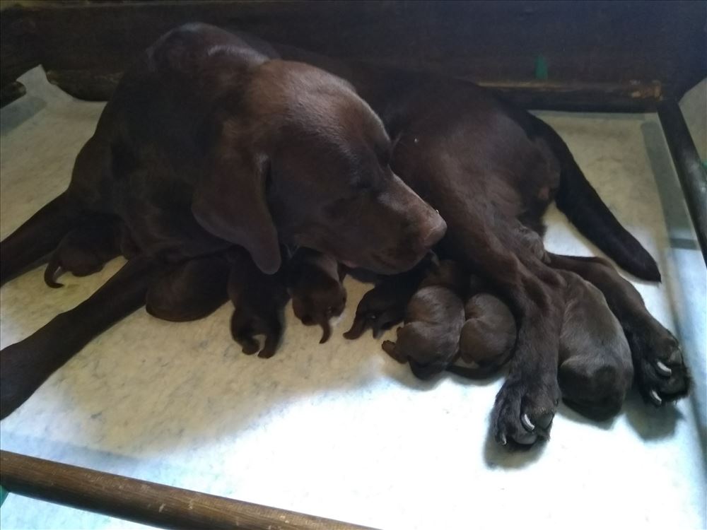 Ecco il frutto del grande amore tra Mina e il suo partner Hartung! 8 bellissimi cuccioli chocolate, 5 femmine e 3 maschi.